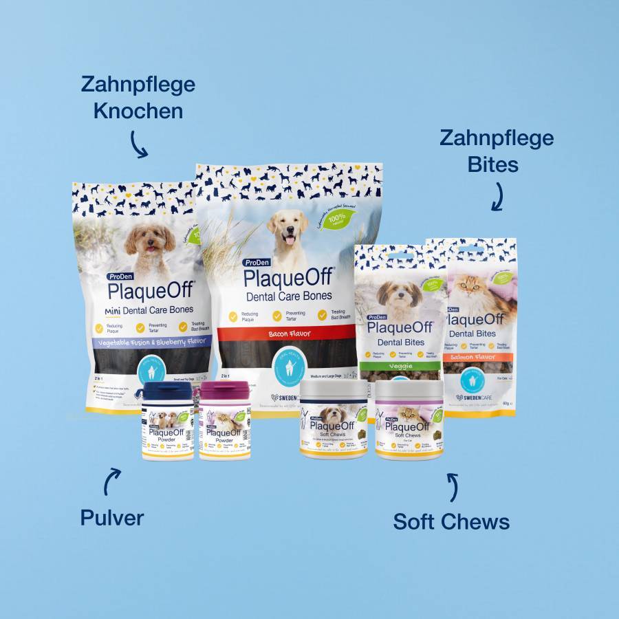 Bei Swedencare steht die Zahngesundheit deines Haustiers im Mittelpunkt. Unsere ProDen PlaqueOff® Produktlinie mit dem exklusiven, natürlichen und klinisch geprüften Algen-Wirkstoff A.N ProDen® ist darauf ausgelegt, Zahngesundheitsprobleme vorzubeugen, bevor sie entstehen. Zähneputzen bleibt der Goldstandard in der Zahnpflege, aber wir wissen, dass das nicht immer problemlos gelingt. Genau hier setzt ProDen PlaqueOff® an: Es hilft, Zahnstein zu reduzieren, Zahnbelag zu kontrollieren und den Atem zu verbessern, ganz ohne Stress. Entdecke unser komplettes Sortiment an flexiblen und einfach anzuwendenden Produkten von ProDen PlaqueOff®, ideal für jeden Alltag. Ob einzeln oder in Kombination angewendet - sie sind der Schlüssel zu unkomplizierter Zahnpflege.